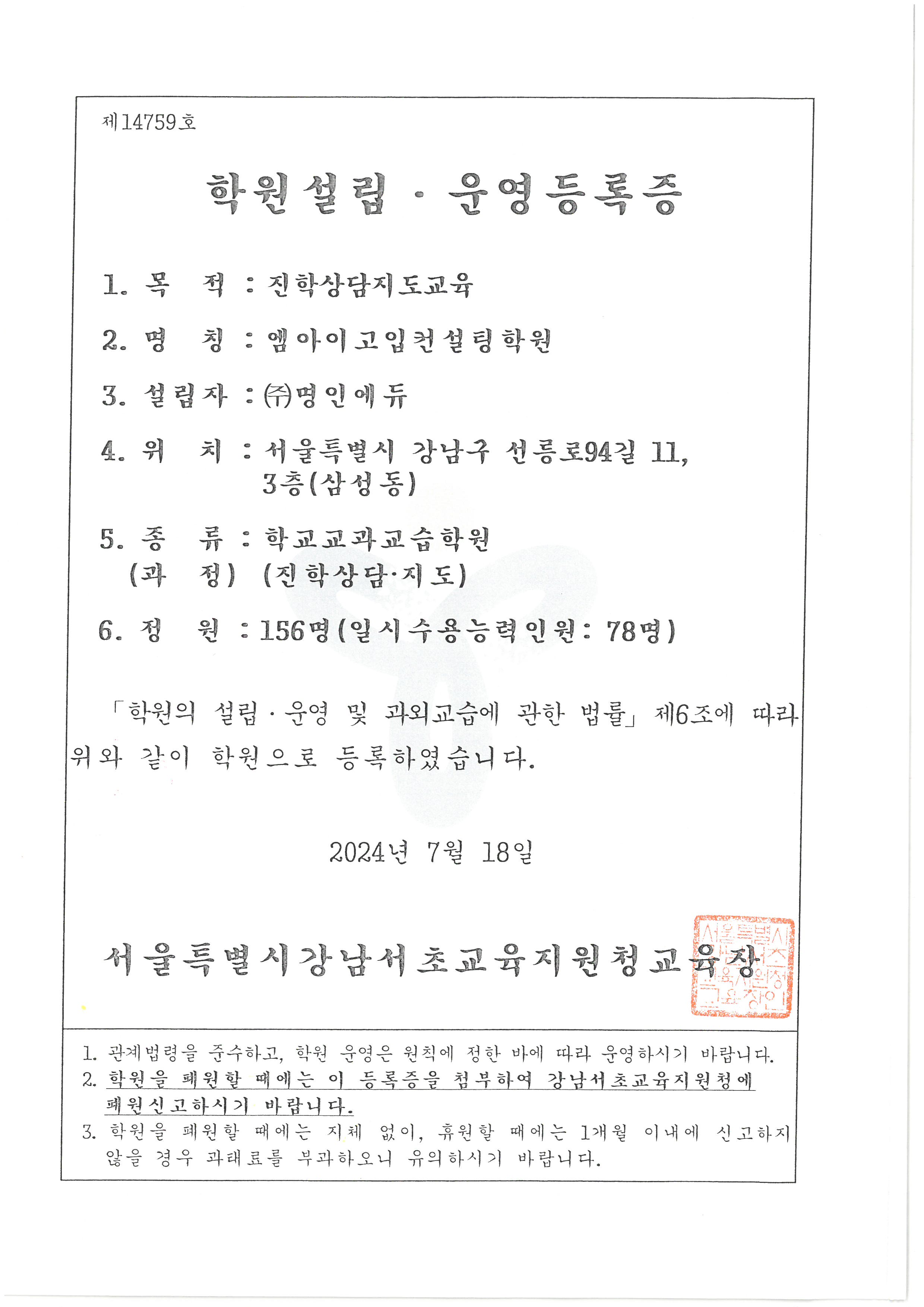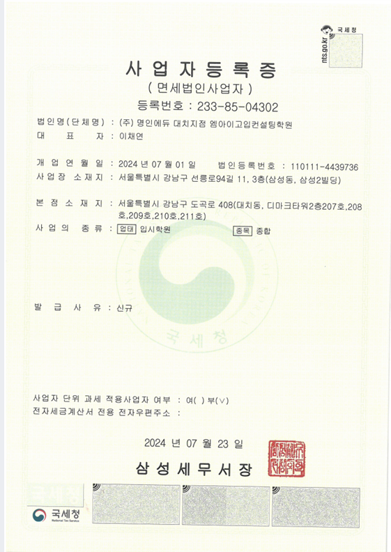 대표자:이채연ㅣ사업자번호:233-85-04302ㅣ대표전화:02) 555-8777ㅣ개인정보관리자:명인학원(web@myunginedu.co.kr)